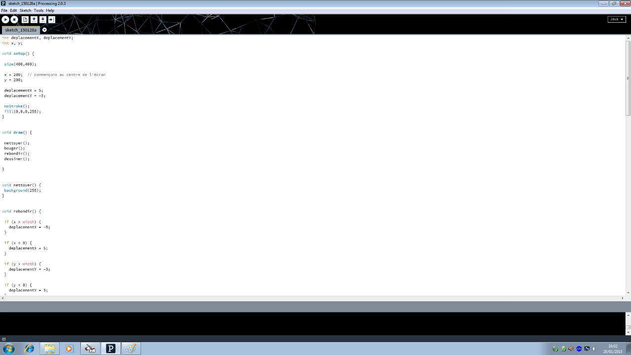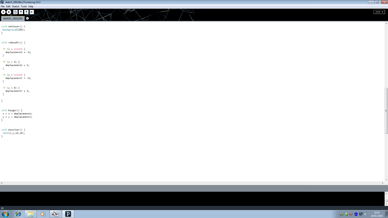 y=y+deplacementY; //permet d'ajouter au x de la balle la valeur de son déplacement sur l'axe des X